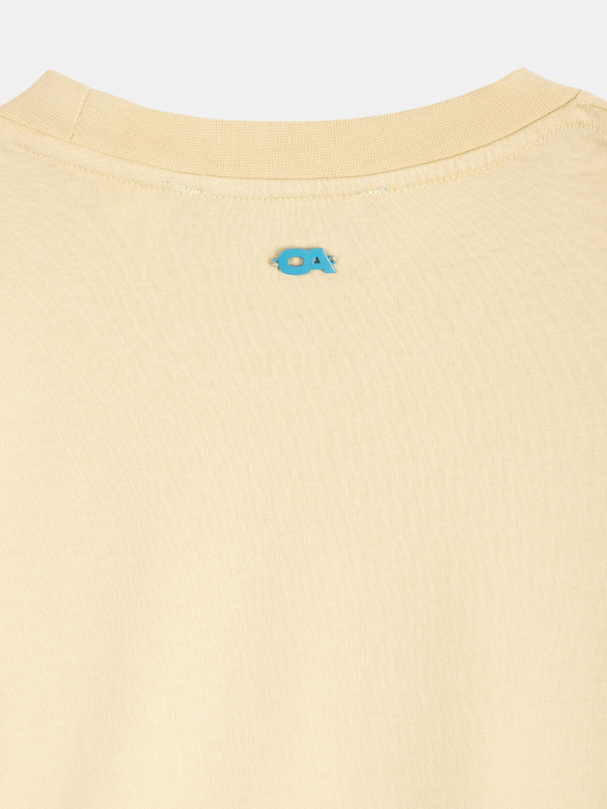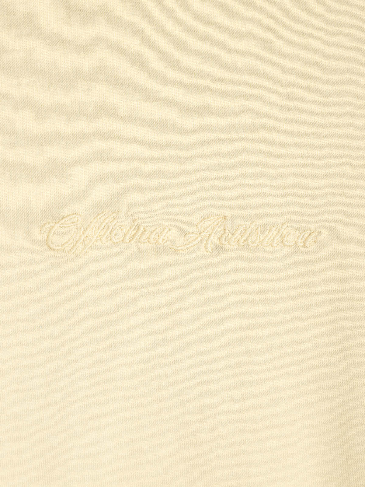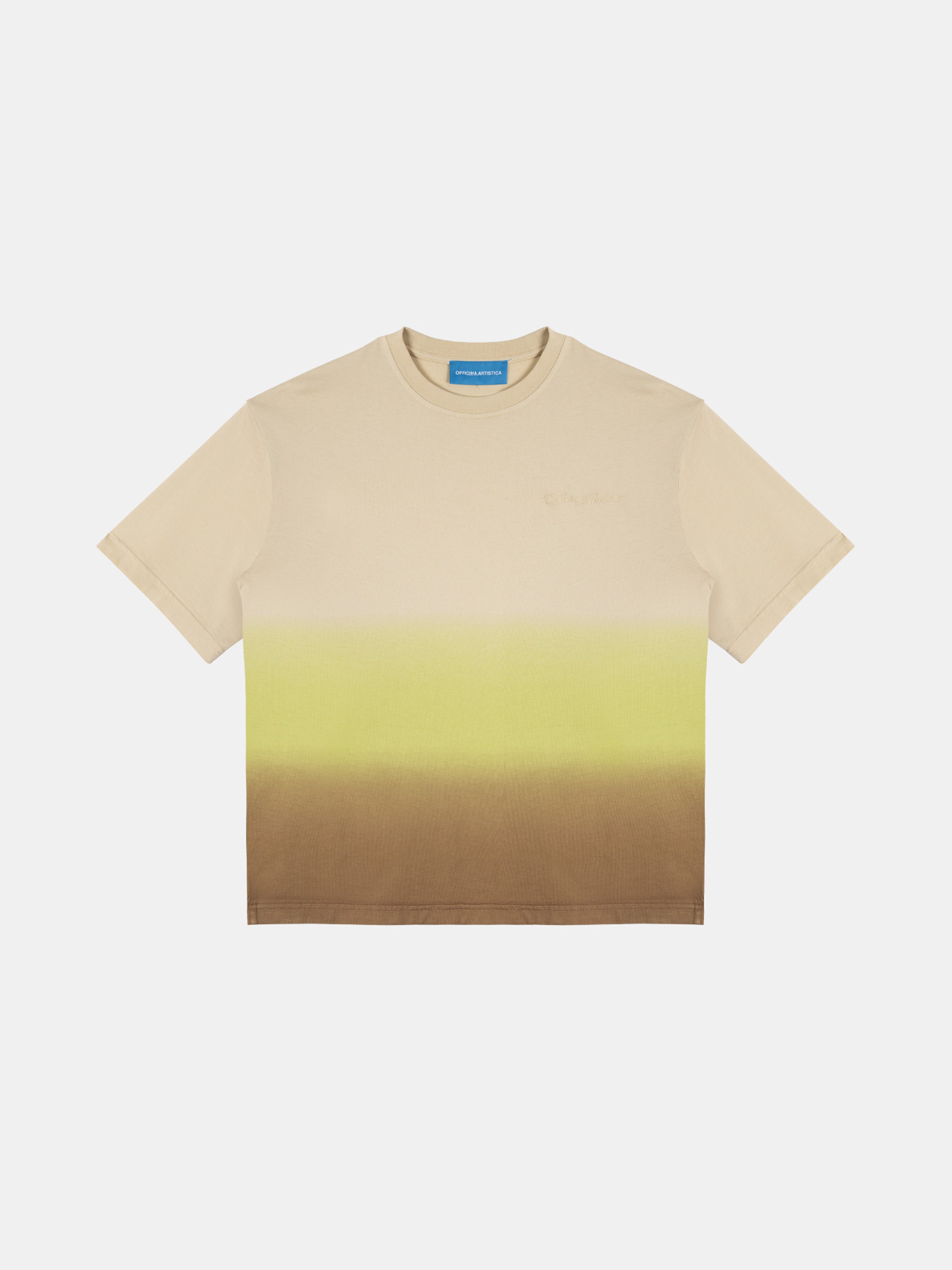 T-shirt 100% cotone multicolor sfumata dal biscotto al mocha mousse, passando per il verde acido con ricamo OFFICINA ARTISTICA tone on tone sul lato sinistro.